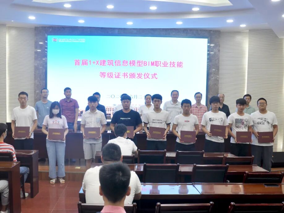 会上,张小林对本次技能等级考试工作进行了全面总结,对培训教师的辛勤付出予以肯定,并从国家政策及就业方面说明了获取技能证书的重要性。程斌宣读获得本次等级考试证书的学生名单。随后,与会嘉宾为学生代表颁发了“1+X”建筑信息模型(BIM)职业技能等级证书,这也是国家职业改革“1+X”证书制度试点工作开展以来该校发放的首批证书。